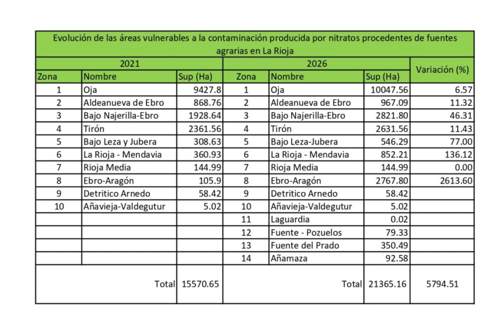 Amigos de la Tierra La Rioja ha comprobado que, si en el año 2021 las zonas vulnerables a la contaminación producida por nitratos procedentes de la agricultura ascendían a 15.570,65 Ha, ahora en 2026 ascienden a 21.365,16 Ha. Es decir, que un recurso tan básico como el agua para la vida se encuentra contaminado en 14 acuíferos por la agricultura. Ni en una sola de las zonas declaradas como vulnerables se ha producido un descenso de la superficie afectada, desde el 2021 al 2026. La declaración de una zona como vulnerable lleva consigo una limitación en cuanto a los abonados nitrogenados a aplicar al suelo.