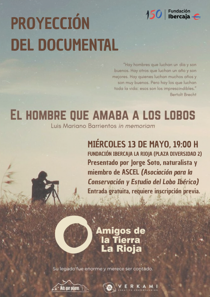 🐺Amigos de la Tierra La Rioja, junto a ASCEL (Asociación para la Conservación y Estudio del Lobo Ibérico), organizan la proyección del documental “El hombre que amaba a los lobos”.