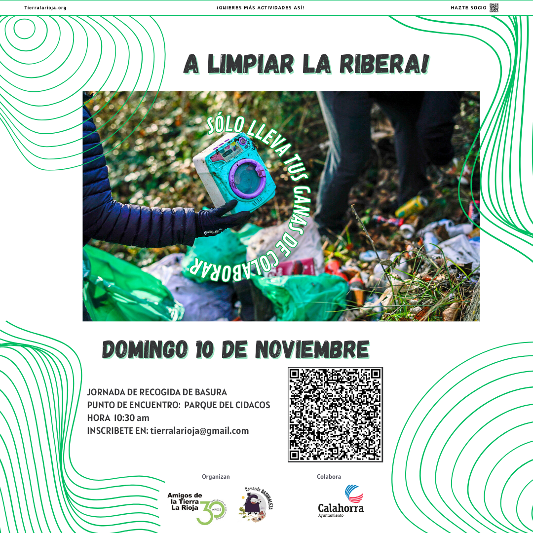 El domingo 10 de noviembre nos encontraremos en el parking gratuito junto al parque de la ribera del Río Cidacos, para, con nuestros amigos del Comando Basuraleza, pasar un rato ameno limpiando la zona. Si quieres colaborar, inscríbete en tierralarioja@gmail.com.