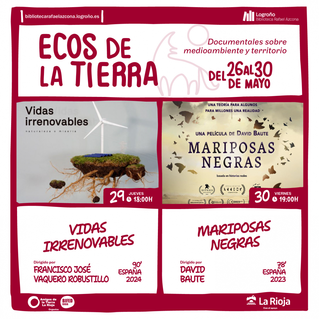 El 29 y 30 de mayo realizaremos ECOS DE LA TIERRA, sección juvenil. Una muestra de documentales sobre medioambiente y territorio, en la Biblioteca Rafael Azcona. Participarán 2 películas españolas que abordan problemáticas actuales frente al cambio climático.